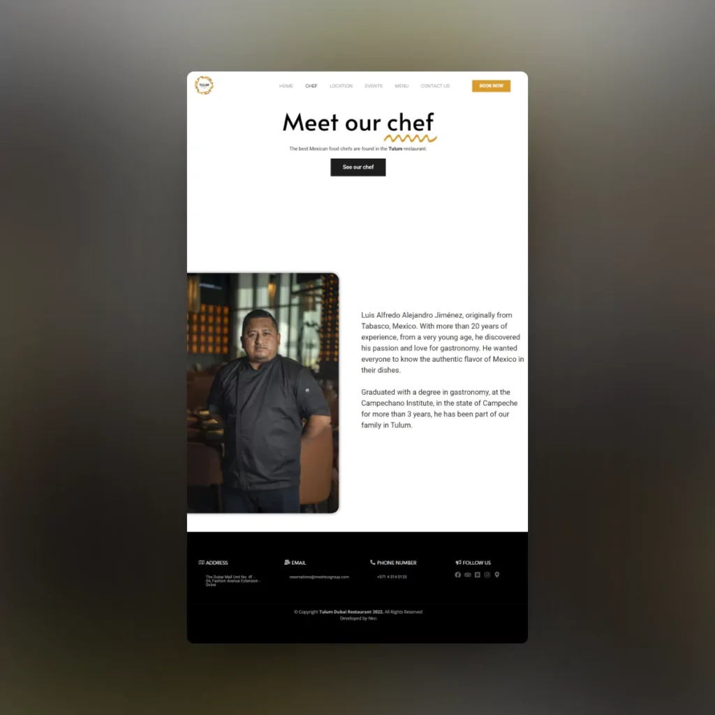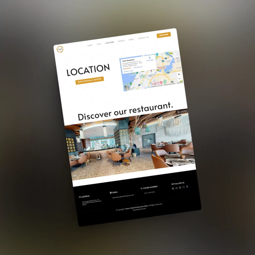 Un paso importante en mi carrera fue mi primer proyecto profesional: el sitio web de Tulum Restaurant. Me encargué de construir la página para este restaurante exclusivo en Dubái, que combina la cocina mexicana con una experiencia de lujo.